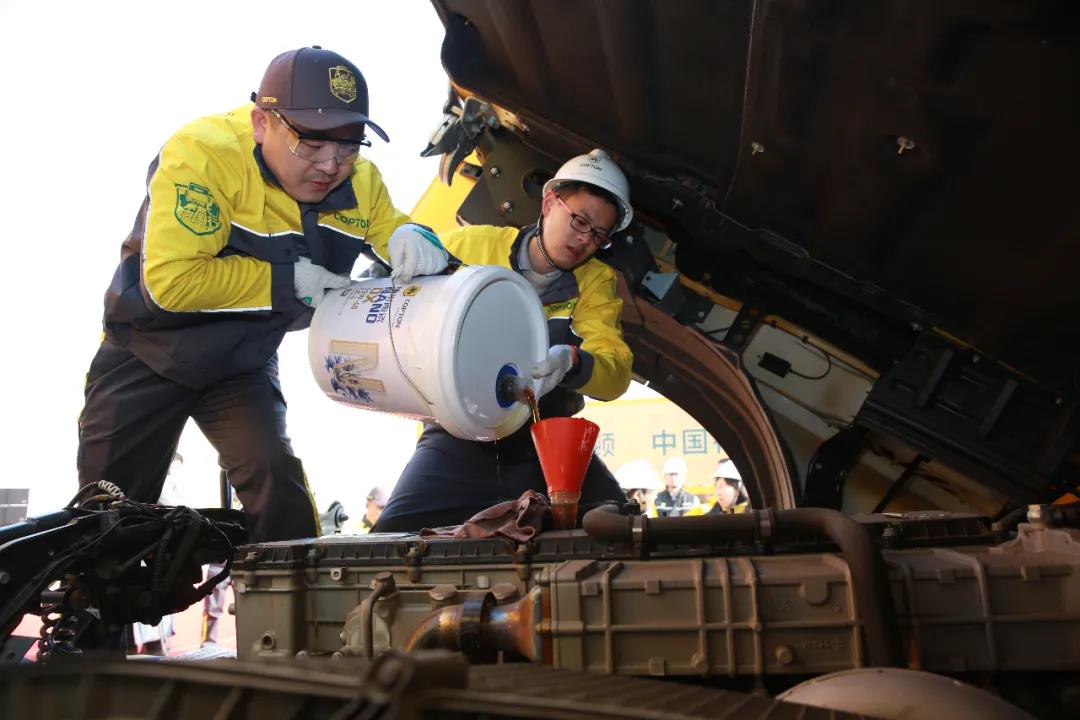 隨著主持人宣布換油儀式開始,專業的重卡保養技師將全車油液放出,并更換康普頓全系油液產品。